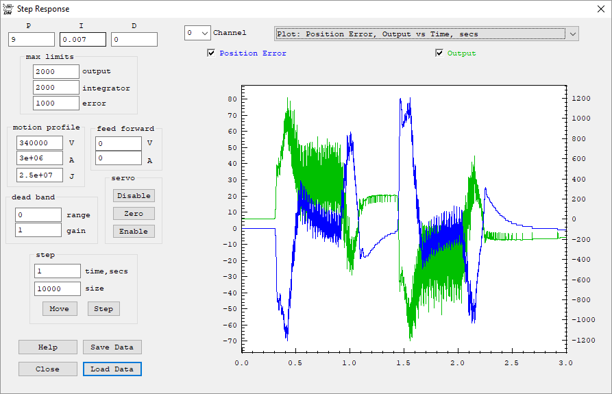 Well the plot is of the error so the value is how much the axis is out of position (according to the encoder). So when the value spikes to +80 that means your axis is in the wrong position by 80 counts. So you might want to consider the biggest spike the biggest error. But it all depends on your requirements. Maybe you don't care about when the axis starts and stops. Or maybe since this is a rapid you don't really care at all as long as it is in position and settled at the end.When reading the error plot which should i focus as the overall error, the height of tallest spikes or the difference between the 2 lines on the graduation at 0 on left of window? If iam figuring it correct i have between .0002" to .0005". Is this what you get?